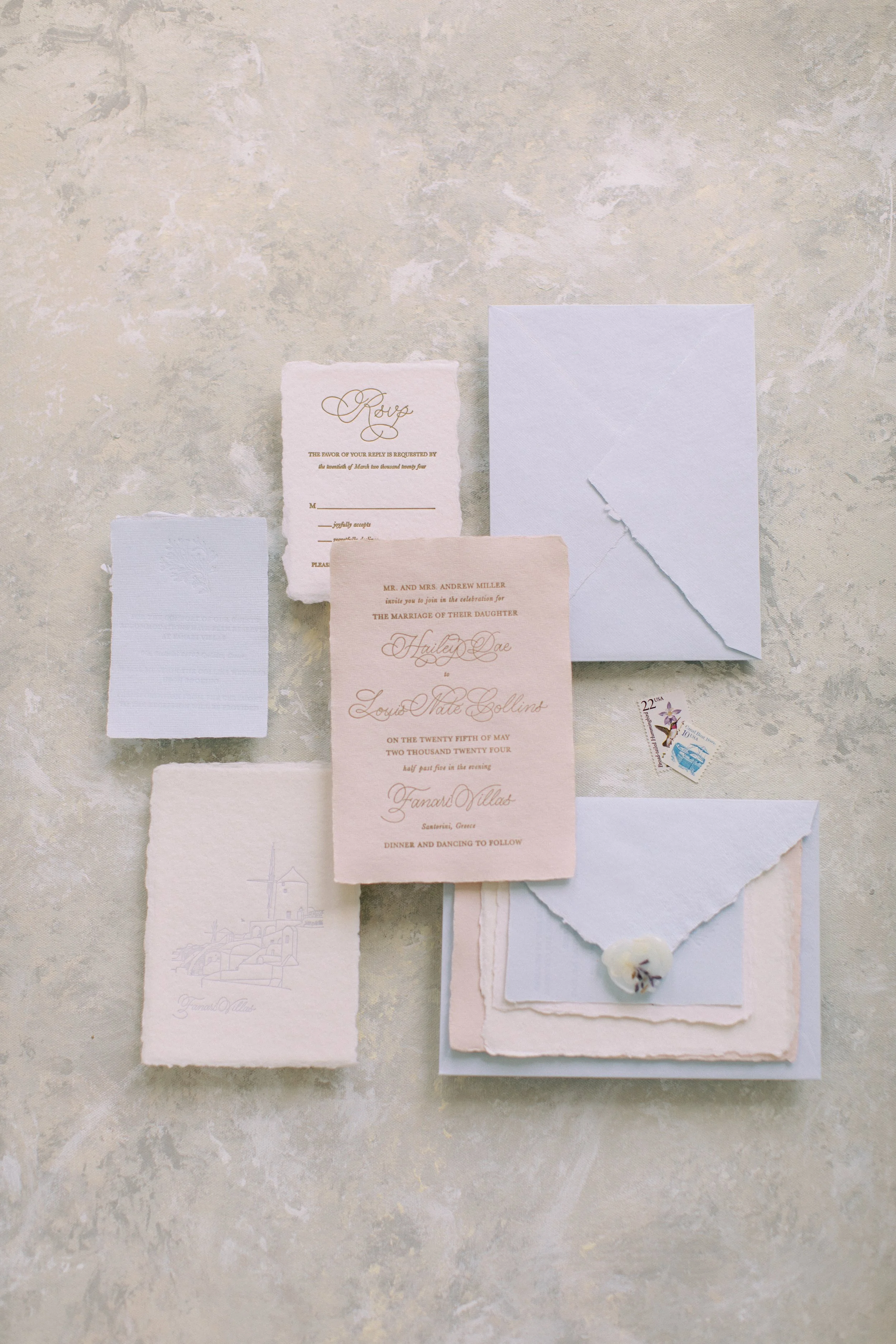 After our design call, you will receive three realistic rounds of proofs that we will review in detail to make sure everything is exactly how you envision it. Each proof will feature a variety of embellishments to consider including wax seals, envelopes, ribbons, postage, and more. Once finalized, we start production which includes addressing, printing, assembly, and mailing.